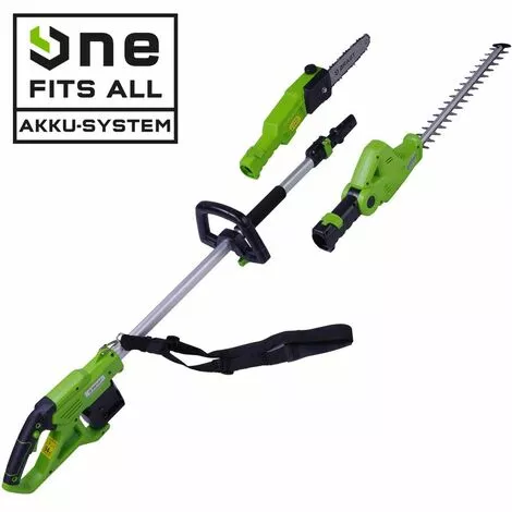 SANS OUTIL : Les deux accessoires, la tronçonneuse 20′ et le taille-haie avec lame de 45 cm à angle réglable sur 8 niveaux de 0 à 120 degrés, peuvent être changés en un rien de temps grâce à la fixation à clic rapide.