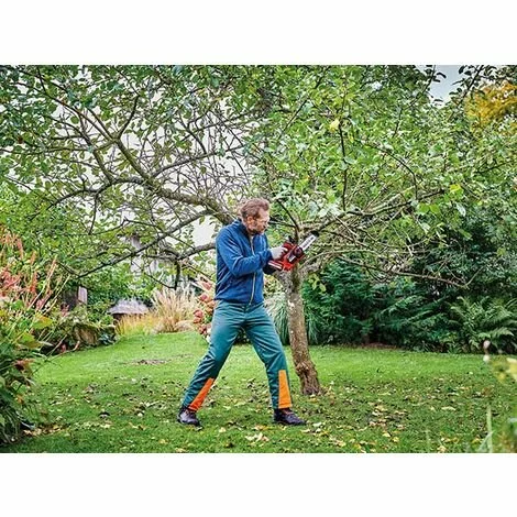 La tronçonneuse sans fil à une main FORTEXXA 18/20 TH Einhell est un outil puissant de la gamme flexible Power X-Change. Maniable, léger et ergonomique, cet outil d’élagage est entraîné par un moteur sans charbon « Brushless » Einhell, plus durable et puissant qu’un moteur à charbon classique. Avec sa chaîne et son guide-chaîne de qualité OREGON, même les branches épaisses n’opposent aucune résistance à la tronçonneuse FORTEXXA. La tronçonneuse FORTEXXA est équipée de plusieurs mécanismes de sécurité : protection d’extrémité prévenant le recul de l’outil, protection anti-rebond avec frein d’arrêt immédiat et goupille d’arrêt de la chaîne. Le réglage de la tension de la chaîne et son changement s’effectuent simplement et sans outil pour une utilisation facilitée. Avec sa grande ouverture de remplissage de l’huile, le système de lubrification automatique facilite l’entretien. La butée dentée en métal est robuste, et la poignée ergonomique à surface Softgrip assure une prise en main ferme et sûre.