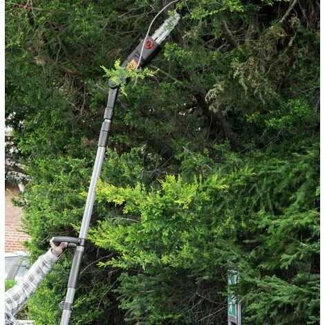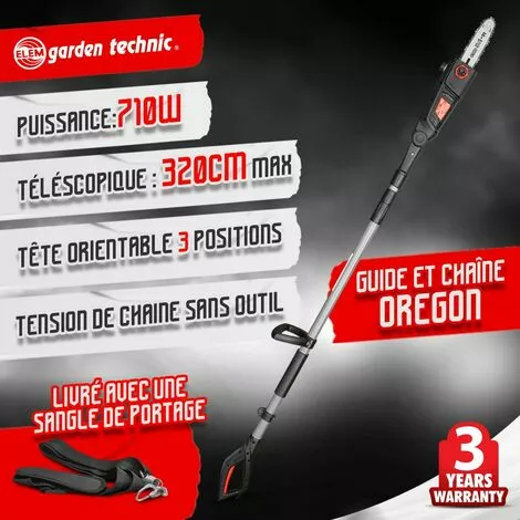 Atteindre les hautes branches n’a jamais été aussi facile avec cette scie à ébrancher sur perche 710W de la marque Elem Garden Technic. Équipée d’un manche télescopique qui peut atteindre une longueur maximum de 3,2 mètres et d’une tête orientable (0-30°), cette scie à ébrancher vous permettra d’atteindre les hautes branches sans décoller les pieds du sol ni prendre le moindre risque. Elle est équipée d’un guide Oregon d’une longueur de 24 cm qui vous offrira la maniabilité nécessaire pour un travail parfait. Cet outil léger est facile à prendre en main.