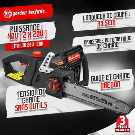 Cette tronçonneuse rechargeable 40V (2x20V) vous permettra de réaliser vos travaux d’élagage et de découpe de votre bois de chauffage sans effort . Elle s’adapte facilement à vos besoins. Elle vous offre une grande liberté de mouvement sans le bruit, les gaz d’échappement, les difficultés de démarrage d’un moteur thermique.