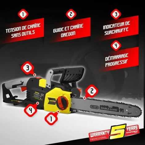 Cette tronçonneuse électrique de la marque Gardeo est équipée d’un puissant moteur 2400W. Elle vous offrira un travail de qualité grâce à son guide Oregon d’une longueur de 457 mm. Silencieuse et légère, c’est l’outil idéal pour les travaux de coupe légers.