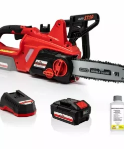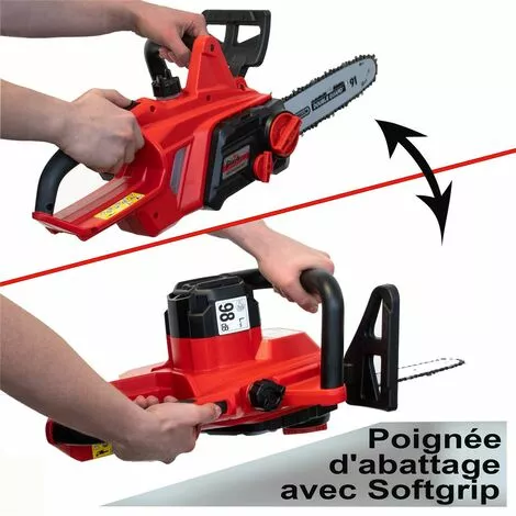 Contenu de la livraison : tronçonneuse à batterie, guide-chaîne, protection du guide-chaîne, 180 ml d’huile de chaîne biologique, batterie, chargeur rapide, mode d’emploi.