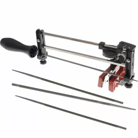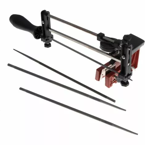 Affuteuse de chaîne manuelle semi-professionnelle livrée avec ses 3 limes rondes diamètre 4 mm, 4,8 mm et 5,5 mm et son manche de lime en plastique. Cette affuteuse se fixe sur le guide de la tronçonneuse à l’aide d’un étau en fonte d’aluminium, les différents réglages permettent d’affuter votre chaîne de tronçonneuse au bon angle en fonction du Pas de votre chaîne 3/8 Picco ou 1/4 (4mm), 325 (4,8mm) et 3/8 ou 404 (5,5mm). Livrée complète et montée elle est prête à l’emploi. Affuteuse manuelle professionnelle également disponible en stock pour les utilisations plus intensives.