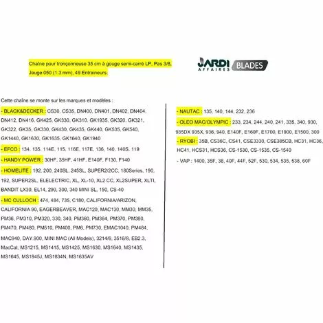 Chaîne Professionnelle longueur 35cm pour tronçonneuse, Pas 3/8, jauge 050/1,3mm, 49 Entraineurs. Correspondance Oregon 91-49E. Cette chaîne pour tronçonneuse de 35 cm se monte sur les marques Homelite, Mc Culloch, Ryobi, Efco, Handy Power, Oleo Mac, Nautac et Black&Decke. Voir notre tableau d’affectation en photo ou nous contacter pour vérifier avant de commander votre chaîne.