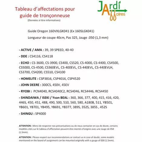 Guide Oregon 160VXLGK041 pour tronçonneuse d’une longueur de coupe de 40 cm. Pas 325, Jauge 1,3mm. Le guide 160VXLGK041 est la nouvelle version du modèle 160SLGK041 et le remplace. Ce guide s’adapte essentiellement sur les tronçonneuses de marques : ACTIVE, AMA, DDE, ECHO, HOMELITE, JOHN DEERE, RYOBI, SHINDAIWA, ISEKI, BEAL, SHINGU Ce guide se monte généralement avec une chaine de 66 maillons entraineurs (dents qui entrent dans le guide). Voir tableau d’affectation par marques et modèles en photo sur la fiche produit. Merci de respecter nos préconisations ou de nous contacter en cas de doute, ATTENTION certains modèles cités sur le tableau d’affectation peuvent être montés d’origine avec une Jauge de 058 (1.5mm).