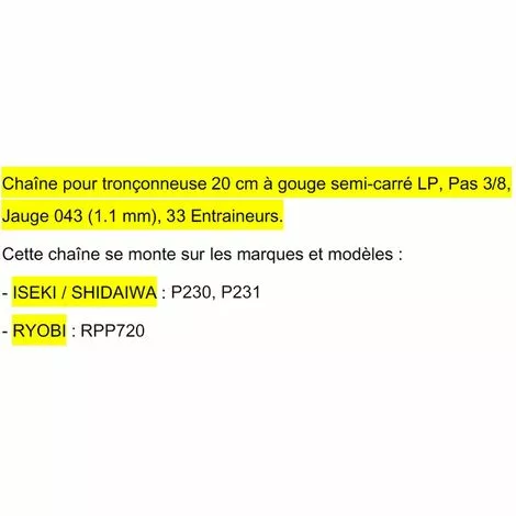 Ce guide d’affutage permet de toujours conserver le bon angle d’affutage pour votre chaine de tronçonneuse. 4 Angles d’affutage sont gravés afin d’obtenir le meilleur affutage : Angle de 10 degrés, de 25 degrés, de 30 degrés et de 35 degrés. Ce guide se clips sur les limes de différents diamètres (3 / 3.2 / 4 / 4.8 / 5 / 5.5mm…) Découvrez toutes nos solutions pour l’affutage manuel (kit complet, lime ronde, lime plate…), un affutage manuel offre une meilleure précision et une plus grande résistance à votre chaine de tronçonneuse