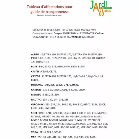 Guide professionnel pour tronçonneuse longueur 30cm Pas 3/8 jauge 0.50 (1.3mm) correspondances Oregon 120SPEA074 et 120SDEA074, Carlton CA1226N144PT et 12-26-N144-HC, Windsor 12ST50SSR, ce guide pour tronçonneuse se monte sur les marques ALPINA, BLITZ, CASTEL, CASTOR, DYNAMAC, GARDEN, METABO, NAUTAC, OLEO MAC, STIHL, STIGA et VAP, voir tableau d’affectation en photo. Découvrez également nos Combos 1 guide + 4 chaines 44 maillons entraineurs ou 1 guide + 1 chaine 44 maillons entraineurs.