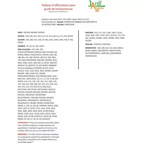 Guide professionnel pour tronçonneuse longueur 35cm Pas 3/8 jauge 0.50 (1.3mm) correspondances Oregon 140SDEA318, Carlton CA1438N152RK et 14-38-N152-MHC, Windsor 14MC50SSR, ce guide pour tronçonneuse se monte sur les marques ALKO, ALPINA, CASTOR, MC CULLOCH, POULAN, PARTNER, GARDEN et REMINGTON, voir tableau d’affectation en photo. Découvrez également nos Combos 1 guide + 4 chaines 50 maillons entraineurs ou 1 guide + 1 chaine 50 maillons entraineurs.