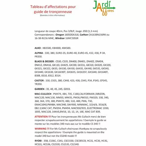 Guide professionnel pour tronçonneuse longueur 40cm Pas 3/8 jauge 0.50 (1.3mm) correspondance Oregon 160SDEA318, Carlton CA1638N156RK ou 16-38-N156-MHC, Windsor 16MC50SSR, ce guide pour tronçonneuse se monte sur les marques ALKO, ALPINA, BLACK DECKER, CASTOR, GARDEN, MAC CULLOCH et RYOBI, voir tableau d’affectation en photo. Découvrez également nos Combos 1 guide + 4 chaines 56 maillons entraineurs ou 1 guide + 1 chaine 56 maillons entraineurs.