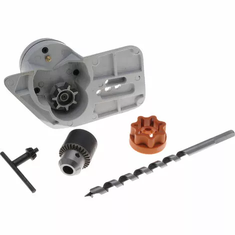 Kit perceuse adaptable sur tronçonneuse Stihl 021, 023, 025 ou MS210, MS230 et MS250 et tronçonneuse Holzfforma G255. Cet ensemble se monte à la place du guide, la liaison est assurée entre le pignon (ATTENTION pignon à 6 dents en 3/8LP OBLIGATOIRE, ne convient pas avec pignon en 325 !) et la tronçonneuse par un coupleur. Percez des trous n’importe ou en toute tranquillité, pas de fil, pas de batterie, juste votre tronçonneuse. Livrée complet avec mandrin, clé à mandrin et un forêt à bois pour tester rapidement les capacités de cette perceuse thermique.