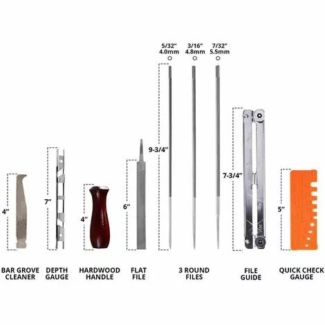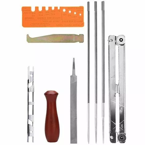 Comprend: 3 limes rondes, porte-limes, lime plate, jauge de profondeur, poign��e, nettoyeur de rainure de barre, jauge de contr?le rapide, pochette