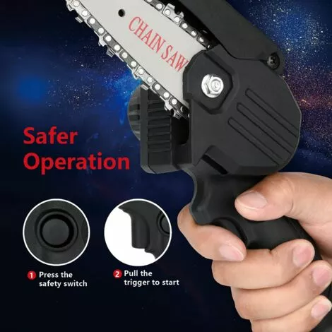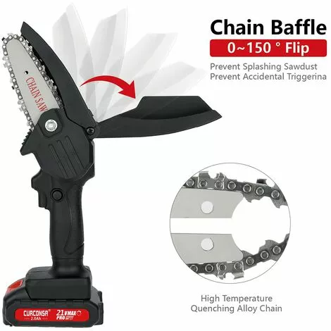- 【Plus Sûr à Utiliser】 Afin d’assurer la sécurité, la mini tronconneuse a batterie est équipée d’un verrou de sécurité. Appuyez d’abord sur le verrou de sécurité, puis appuyez sur la gâchette pour démarrer la scie à main. Le haut de la chaîne est équipé d’une plaque de protection amovible qui peut pivoter à 150° pour éviter les éclaboussures de sciure lors de la coupe et de l’élagage des branches