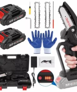 【 TRONCONNEUSE SANS FIL PLUS PRATIQUE】En raison de son poids léger, de ses faibles vibrations, la mini tronçonneuse sans fil peut être utilisée d’une seule main, elle peut également être facilement contrôlée et utilisée par les femmes. Nous sommes également équipés d’une boîte de rangement portable qui est facile à ranger et à transporter. L’ensemble des tronçonneuses électriques a été installé, il vous suffit d’installer la batterie et d’ajuster le serrage de la chaine.