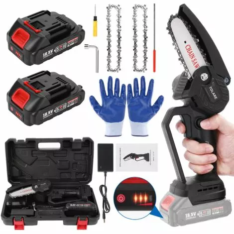 【 BATTERIE PLUS DURABLE】 La mini scie electrique portable est équipée d’une batterie au lithium rechargeable 2 pièces 2500mAh, la batterie a un affichage de puissance sur le côté, qui peut montrer la puissance restante. Après des tests réels, la capacité de la batterie de la tronçonneuse Tolare est supérieure à celle de la plupart des produits similaires sur le marché. La tronçonneuse est protégée contre la surchauffe et peut continuer à être utilisée après refroidissement.