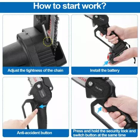 【 TRONÇONNEUSE PLUS EFFICACE】 La mini tronçonneuse sans fil Tolare adopte une chaîne de guidage de dureté extra élevée qui assure une coupe en douceur. La vitesse de coupe peut être ajustée en fonction de l’intensité et des conditions de fonctionnement par interrupteur, mieux protéger les arbres. Pour plus de sécurité, retirez la batterie de la mini-tronçonneuse et verrouillez le verrou de sécurité lorsqu’elle n’est pas utilisée. Veuillez noter que la longueur de la mini tronconeuse est de 10cm.